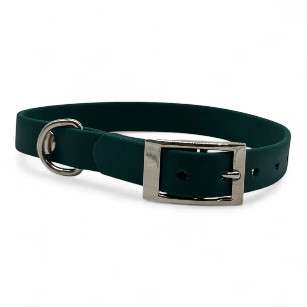 Dit is een ‘pre-made’ standaard halsband in de kleur ‘dark green’ met een chroom hardware afwerking.