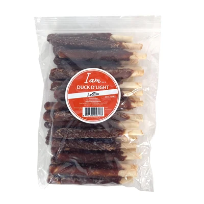 I Am Duck D’Light Lollies zijn smakelijke hondensnacks met een combinatie van eend en runderhuid. Deze snacks hebben een leuke lollyvorm en zijn geschikt als beloning of tussendoortje. De stevige structuur nodigt uit tot kauwen en de eiwitrijke samenstelling maakt ze extra aantrekkelijk voor honden.