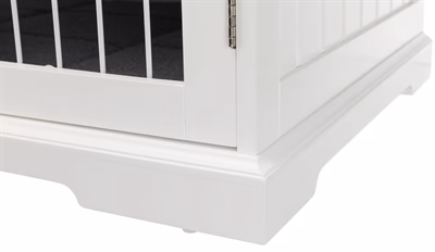 Met deze bench heeft jouw hond een fijn eigen plekje in huis, dat ook nog bij jouw interieur past! Deze mooie bench is gemaakt van witgelakt MDF, met een deur die voorzien van is van tralies. Zo voelt jouw dier zich veilig en geborgen en heeft het toch een plek om overzicht over de ruimte te houden. De bench komt met een behaaglijke mat in schapenvachtlook, voorzien van een schuimrubber vulling voor veel comfort. De slipvaste onderkant zorgt dat de mat goed op zijn plek blijft liggen.