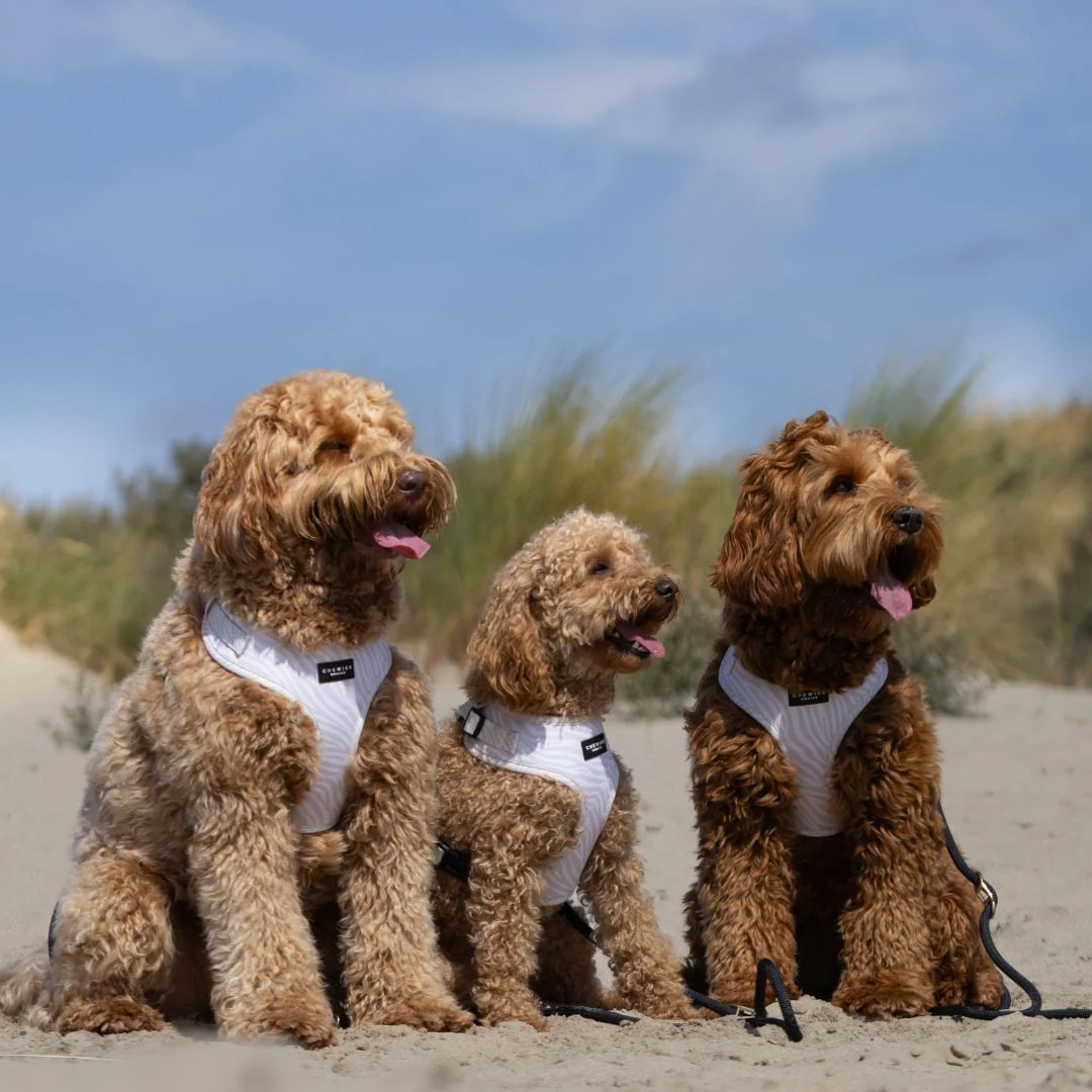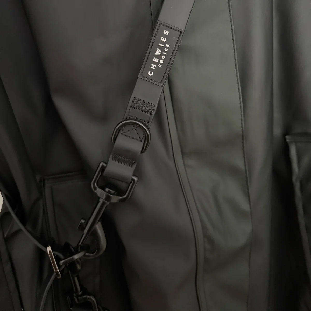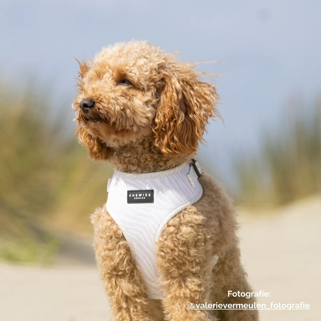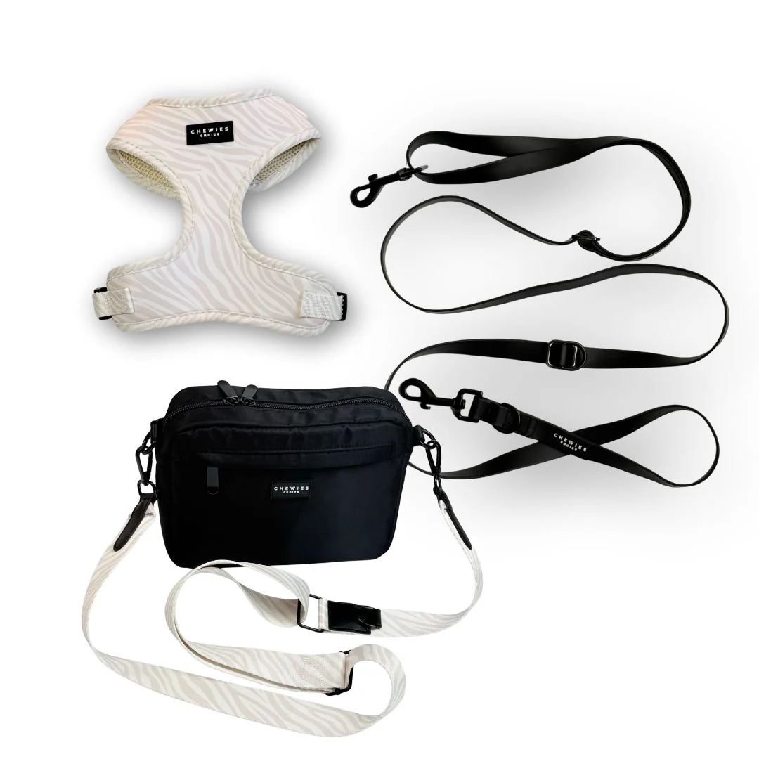 Deze luxe set bestaat uit een verstelbaar hondentuigje, een waterafstotende Dog Mom Bag met matching bag strap én een handsfree waterproof hondenriem.