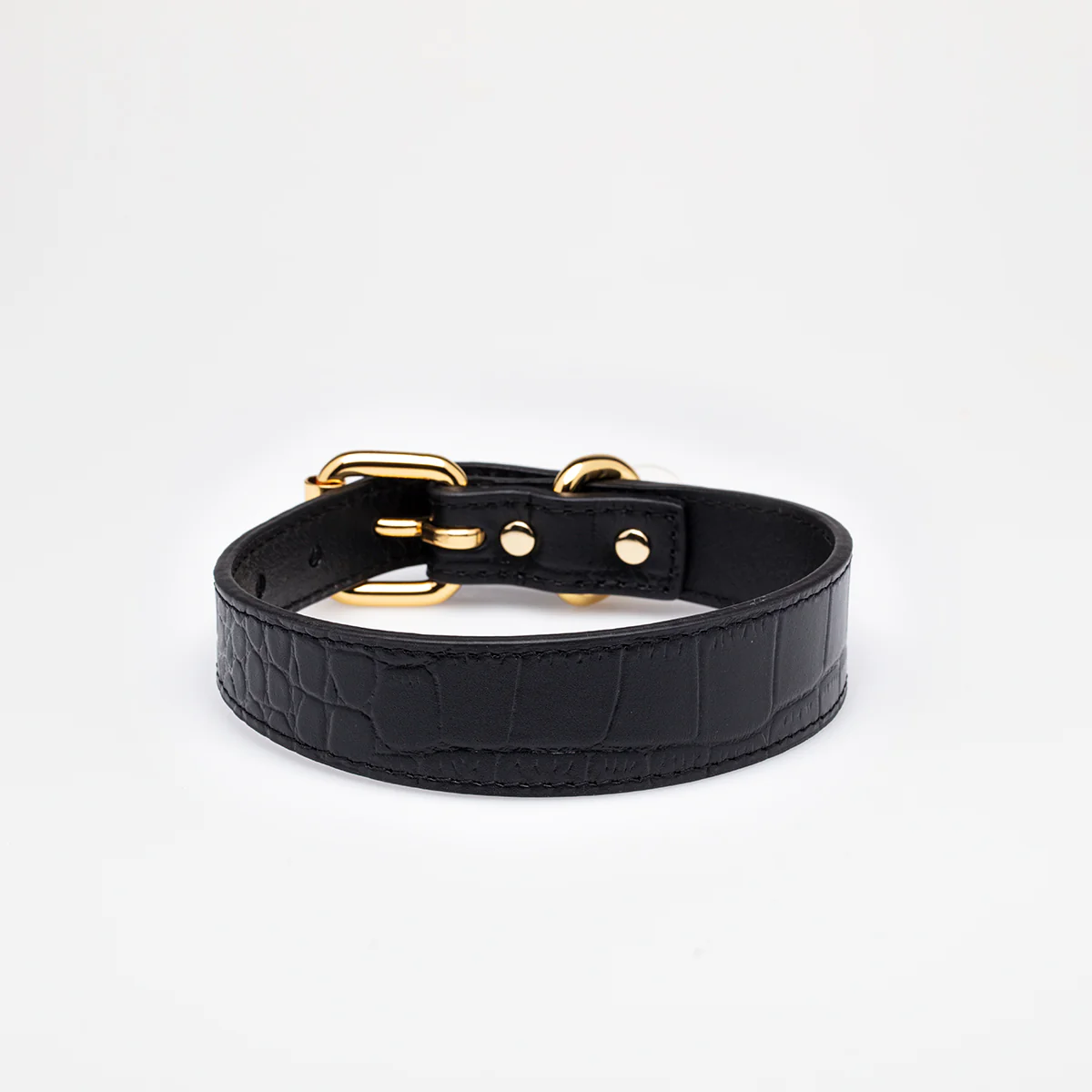 Deze Black Croco Collar Thin is een elegante en stijlvolle halsband die je hond laat opvallen tijdens de wandeling. Het zachte materiaal en de verstelbare pasvorm zorgen zowel voor comfort als veiligheid. Of je nu naar het hondenpark gaat of gewoon een ontspannen wandeling door de buurt maakt, deze halsband geeft je hond een verfijnde uitstraling met een vleugje avontuur.